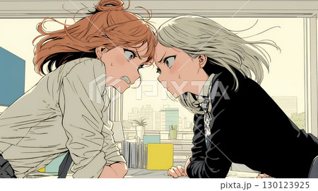 オフィスで話し合うビジネスマンとビジネスウーマンのカラーイラスト