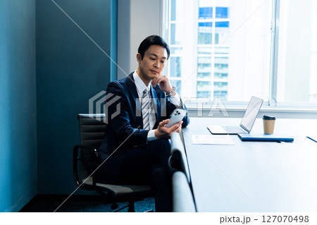 オフィスでスマホで電話するスーツ姿のビジネスマン