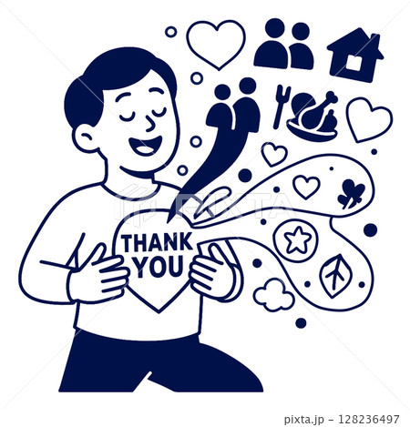 Coloring line art featuring joyful character expressing gratitude with hearts and symbols