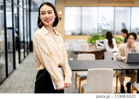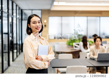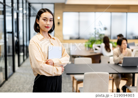 ノートパソコンを両手で持って笑顔で立つビジネスウーマン