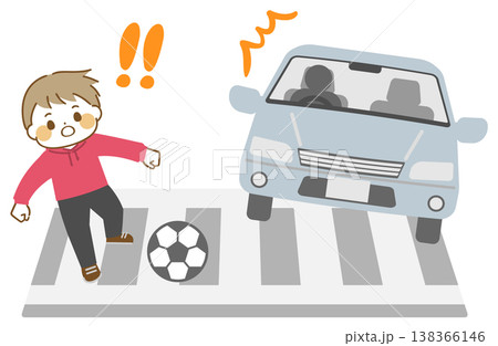横断歩道に飛び出して自動車に驚く男の子のイラスト