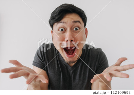 Headshot of shock face man in black t-shirt stand isolated on white.