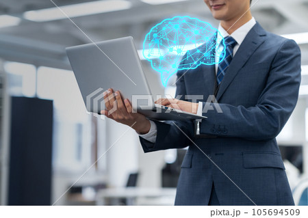 オフィスで人工知能をパソコンを使って働く若い新入社員の男性のビジネスマン