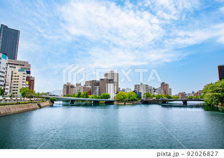 段原町の猿猴川緑地から広島駅前のビッグフロントビル方面を展望しています。前方の橋は大正橋です。