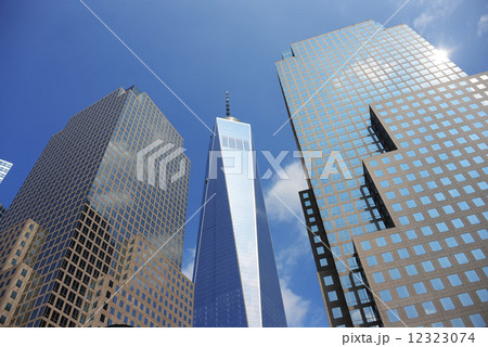 太陽に輝くワールドトレードセンタービルとニューヨーク湾の水面