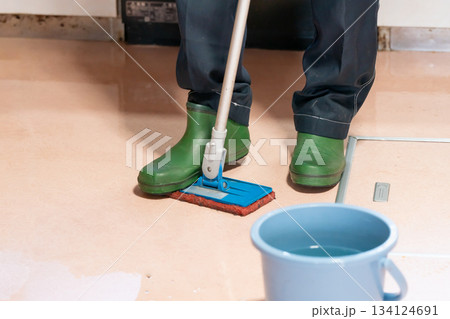 デッキブラシで床磨きする掃除代行業者