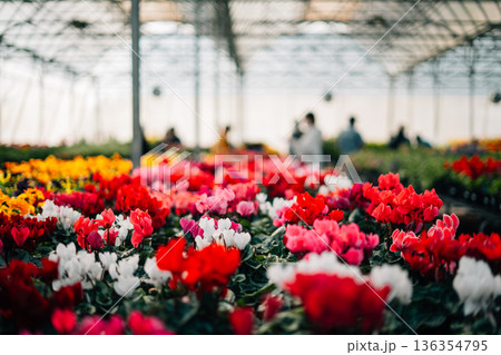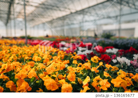 Large selection of blooming colorful flowers in garden center greenhouse nursery