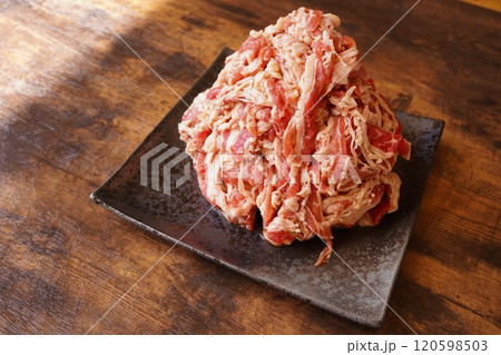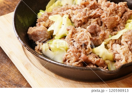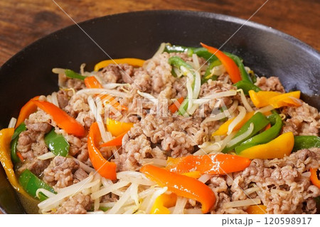 もやしナムルやキムチ、豚肉など沢山の具材が入っているビビンバ丼を白背景で撮影