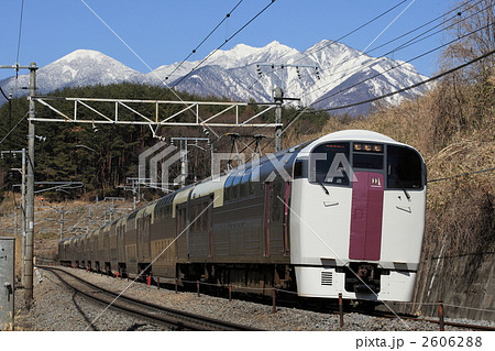残雪の八ヶ岳をバックに走る中央線215系ホリデー快速ビューやまなし号