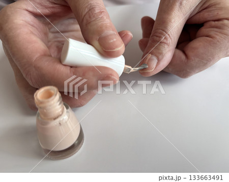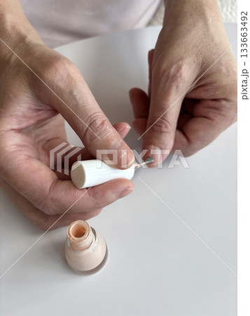 Woman applying beige nail polish at home, natural nude nail color, self-care manicure routine, beauty and grooming concept, close up of female hands painting nails