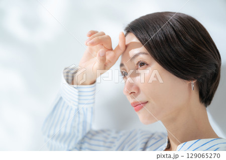 頬に手を添える透明感のある若い女性