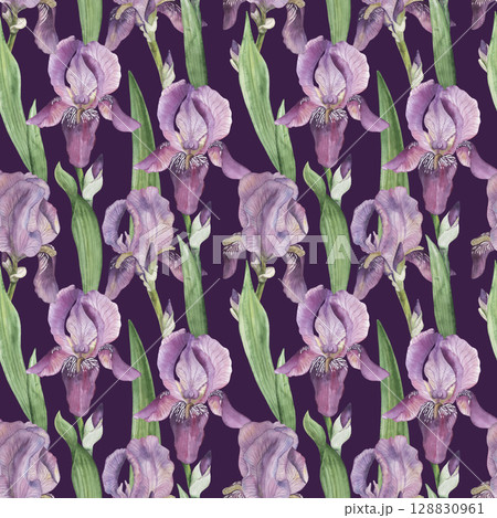 Seamless pattern with lilac irises, green leaves on a dark purple background. The flower illustration is hand-painted in watercolor in a botanical style. For wallpaper design, textiles, fabric, paper