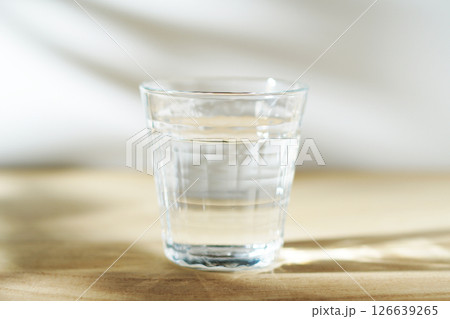 陽ざしの当たったテーブルに置かれた冷たい水