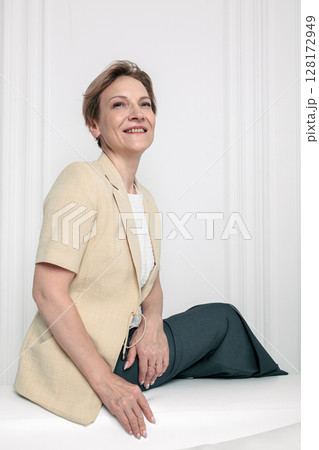 Portrait of happy woman. Confident, successful mature woman on light gray background. Looking at camera. High quality photo