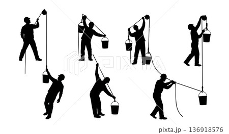 Black Solid Worker Hoisting Bucket Silhouettes Set of Six on White Background