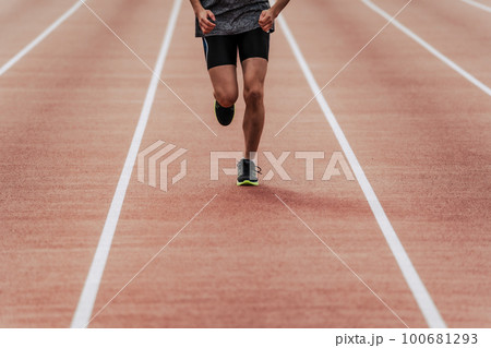 陸上競技のトラックの直線を走る男性ランナー