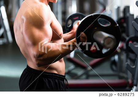 Muscular athletic bodybuilder training arms with barbell