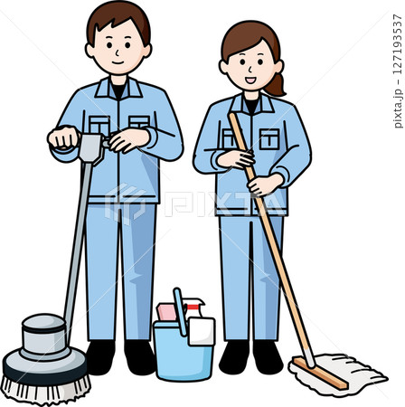 清掃作業員 バキュームクリーナーを持つ男性と女性