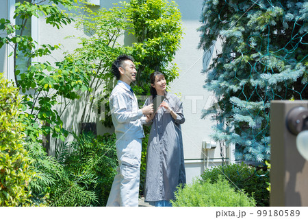 小さな庭とカーポートのある一戸建ての住宅 perming 写真素材