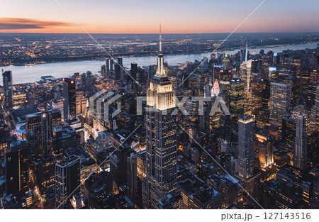 空から見る薄暮のニューヨーク・マンハッタンの街並み