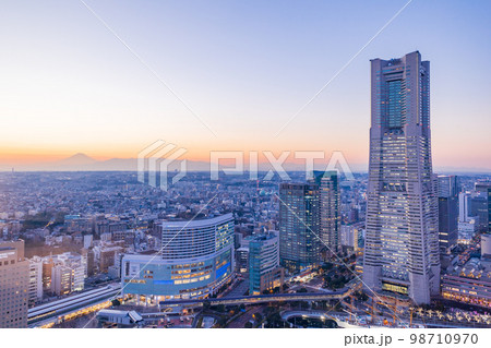 (神奈川県)横浜桜木町駅付近の街並み 富士山遠望 トワイライト