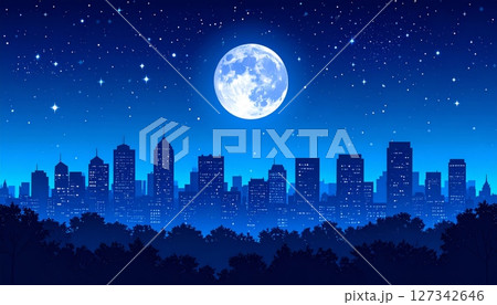 Futuristic glowing night cityscape on dark blue background with lighting effect and sparkle. City landscape.