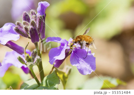 生き物 昆虫 ムラサキダイコンの花を訪れたビロウドツリアブ