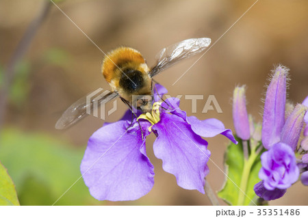 春の花壇で花の蜜を吸うビロウドツリアブ