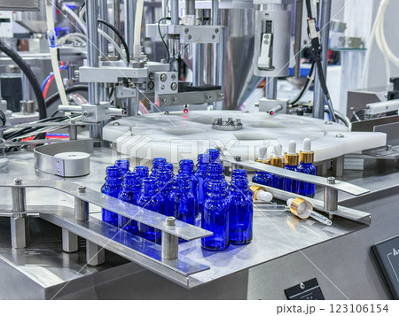 The empty healthcare bottles on the conveyor belt for filling process. T