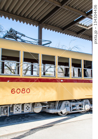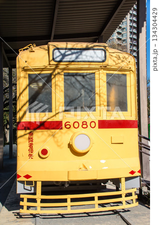 東京都の王子の飛鳥山公園に展示された黄色い歴史的な路面電車