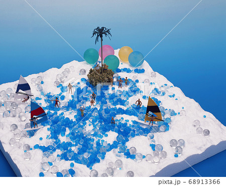 夏のバカンスを楽しむビーズテディベアの仲間たちとサーフボード