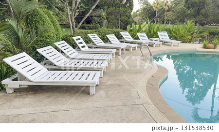 White sun loungers lined beside relaxing swimming pool