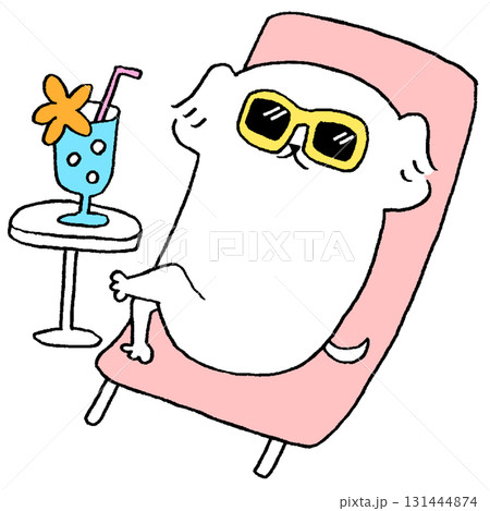 ビーチチェアでくつろぐ犬