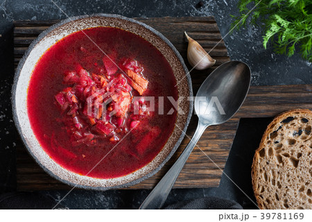 Traditional Ukrainian Russian borscht . Bowl of red beet root soup borsch with white cream . Beet Root delicious soup . Traditional Ukrainian food cuisine