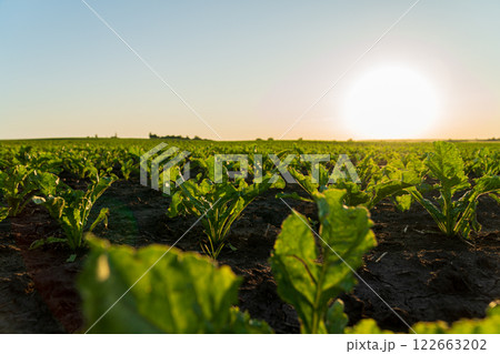 Young sugar beet on a field illuminated by the sun. Plants cultivation. Agriculture.