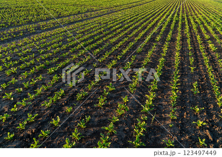 Rows of young sugar beet shoots on a sugar beet field. Landscape view of a young sugar beet field. Green young sugar beet plants growing from the soil. Agricultural concept