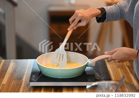 Cropped shot of young woman making simple scrambled egg for breakfast