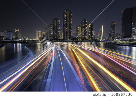 永代橋から見る月島の高層ビル夜景と屋形船の軌跡