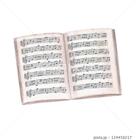 Open music notebook with staff and notes watercolor illustration isolated background. Music paper of book with note stave grid. Lined page template for composers, educators, and songwriters.