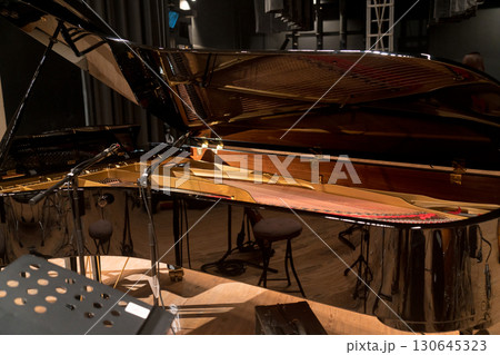 グランドピアノの内部に反射する照明