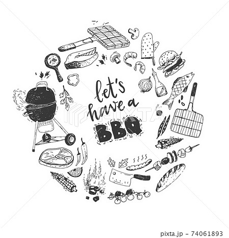 BBQ doodle set. Different elements, food, vegetables, fish and meat, equipment. Vector illustration.