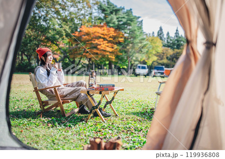 キャンプで飲み物を飲みながらリラックスする若い女性