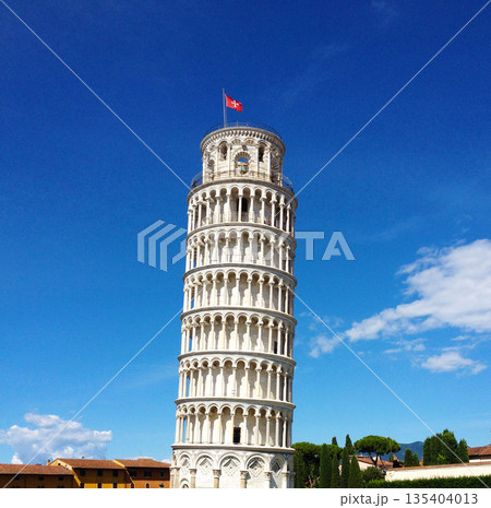Leaning Tower of Pisa with Pisa city flag on the top of it close up at the sky background