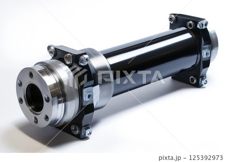 Close-up of a sleek black and silver hydraulic cylinder with precision engineering details, showcasing industrial technology and power