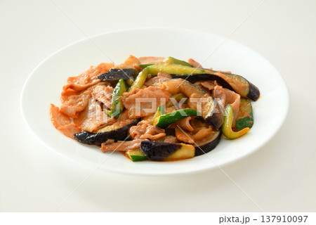 ナスとキュウリと豚肉のピリ辛味噌炒めの料理シーン