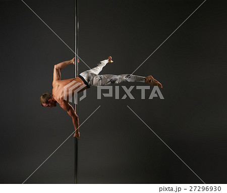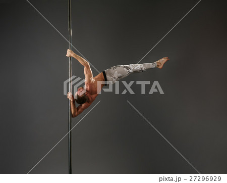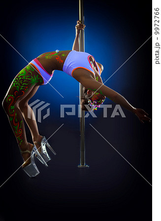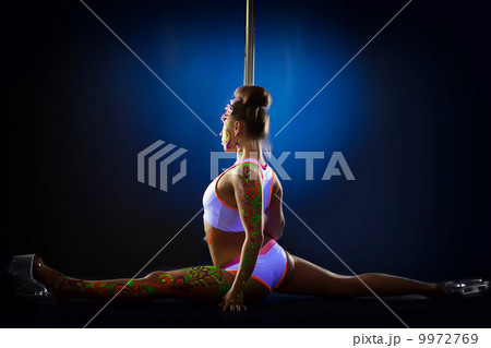 Seductive pole dancer exercising stretching