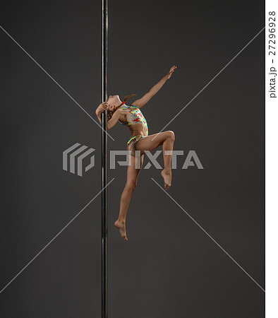 The strong and graceful young girl performing acrobatic exercises on pylon