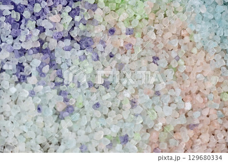 軽く混ぜて平にした数種類の香り付きカラーバスソルト アロマバスソルト