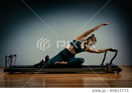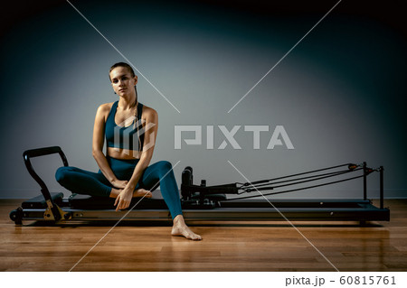 Young girl doing pilates exercises with a reformer bed. Beautiful slim fitness trainer on reformer