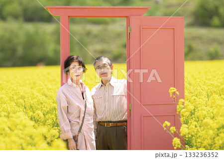 満開の菜の花畑を観光するシニアの夫婦(強レタッチver)